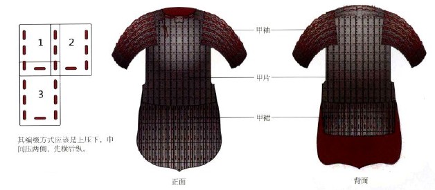 陕西省秦始皇陵除了兵马俑的发现,还随之出土了一批石质甲胄实物,石胄的出土彻底改变了早期“秦代无胄”的说法。身甲根据保护身体部位和甲衣结构的不同有各种不同的类型。有的仿皮甲形制,有的仿铁甲,这些石甲分为三种类型,包括鱼鳞甲、扎甲和马甲,图中所绘的札甲是其中数量最多的一种类型,这些石质甲胄制作起来极其复杂。其甲片厚度不足一厘米米,穿孔时如果受力不均很容易使石甲片折断破碎。所以从易碎这一点也可以右出这些石质甲胄并不是实战装备,而是专门用作陪莽的器具。以石质甲胄随葬可能是秦人的某种信仰和习俗。因为石甲是从铁树甲育的形创仿制而来,所以在秦代可能会有少许与这些石制甲胄形制相同的铁制甲胄。