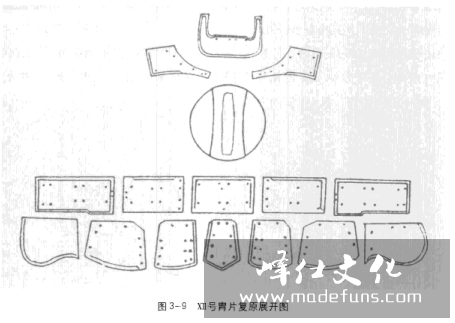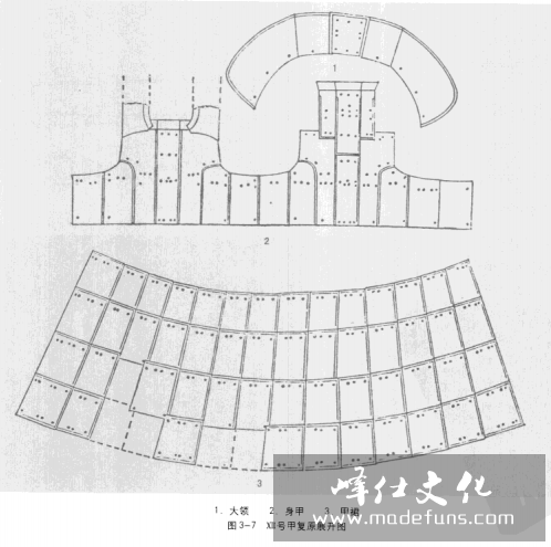 ①身甲 各部用甲片情况与III号身甲基本相同,亦为23片。胸、背甲上部由两片肩片相连,可惜肩片已残损。下部在左肋处以4肋片将胸、背甲的底下组联.右侧为便于穿着的开合口,除前后各2片外.另靠多出的1片甲片搭接。在前胸、后背甲片上缘,均延出有小折领。领口前低后高。在身甲上另缀有由3片甲片组成的大盆领,自后向前折于双肩而呈“u”形。居中一片领片近于方形,左、右两片领片相对称,形制相同。以左侧为例,领片分为两段,其右侧一段呈矩形,与中片等高,通过右侧边孔与中片相连。左侧一段如刀形,上边、左边均有压边,但无穿孔,底边则设3孔。此甲片沿左右两侧的分界线向前折,通过底孔与左肩缀合在一起,形成立干后颈和两肩的大立领,很像秦诵坑陶俑所披之IV式甲的领形,但更为宽大。