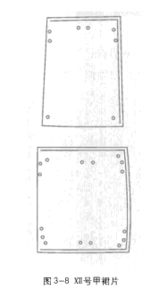 ②甲袖 两袖均残,原应山13个横排、每排4片甲片组成全袖,与I号甲的甲袖相似,每袖应有52片。现右袖基本完好,仅缺9片。左袖残缺较甚,只保存了上面8排的16片甲片。
