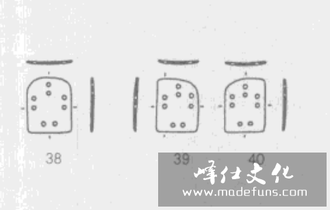 IX型b式和b'式(图39,40)甲片形体、大小、开孔等特征IX型a式,但片形较特殊,甲片下端一角抹圆略呈小刀形,此式实际由IX型a式简化而来,为IXa式甲片长方坯之上端左角或右角未剪切抹圆者,因其甲片抹角处左右相对.故区分为IX型b式(上端右侧抹圆者)和IXb'式(上端左侧抹圆者)。在使用时,IX型b式左侧直边被压于另一甲片下,为铠甲之右半身甲片.IX型b'式则与之相反为左半身甲片。