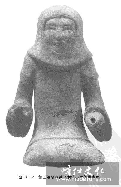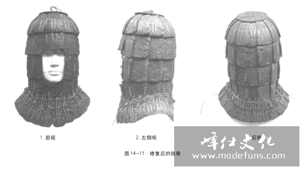复原后的楚王陵铁胄见图14-11。此胄造型的复原,使得人们对辨明狮子山楚王陵陪葬兵马俑坑出土的车兵甲胄俑头上所戴“风帽”属于铁胄的认识,有了一个非常形象的实物印证(图14-12)。