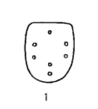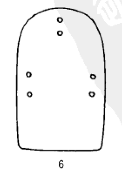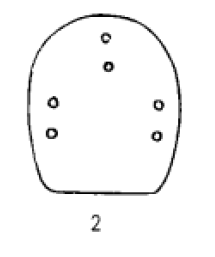 I型(图1)属上平下圆的小型马蹄形片,长2.6厘米.宽1.82厘米。片上开有7孔:左右两侧边各开1对纵列孔.靠上边居中部位开有1孔,与之相对的下边中部开1对纵列孔。