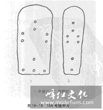 86JYT154:16A这是一个比较完整的铠甲局部,出土时正面朝下,横长36厘米,纵宽29厘米,由长度相近、宽窄不等的两种甲片组成,片形上圆下方。宽形甲片长8厘米,宽3.5一3.8厘米;片上开有10孔,居中偏上、中部两侧各开1对纵孔,底边横列3孔.底部偏上居中开1单孔(图18-19,1)。