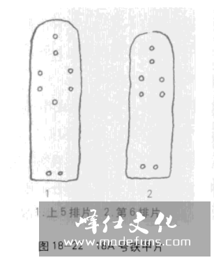 86JYT154:18A 这是一个相当完整的铠甲局部,出土时略作弯曲,大部分正面朝上,个别排向上翻转,横长60厘米,纵宽约28厘米。所用甲片基本属于一种、片形上圆下方,组成6个横排。上而5排片体稍大,纵长8匣米,横宽2.4厘米左右;片上开9孔,顶部居中及中上部两侧各开1对纵孔,中部正中开1单孔(第6排因至底端此孔省略),底部开1对横孔(图18-22).横排上的甲片编排自右向左依次叠压.每排上计有38片。