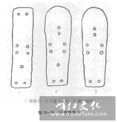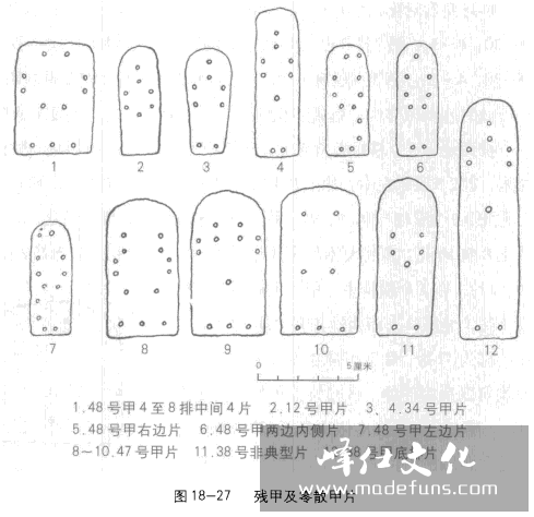 其上甲片基本上为两种:顶排片为长条形,上下平齐。片长6匣米.宽1.6厘米左右,片上开9孔,上下两端各开1对横孔,中部两侧各开1对纵孔,中下部居中开1单孔(图18-26.1).2至7排上的甲片上圆下方,片长6匣米,宽1.6-1.9匣米。片上开9孔,中上部正中及中部两侧各开1对纵孔,中下部居中开1单孔,底端开2横孔(图18-26,2).第8排上甲片,除中下邹居中无孔外,其大小及片上所开8孔与2至7排片相同(图18-26,3),38个横排上的甲片数经复原均为51片,其编排次序一律由左向右叠压.各排纵向的组合是自下而上反向叠压。